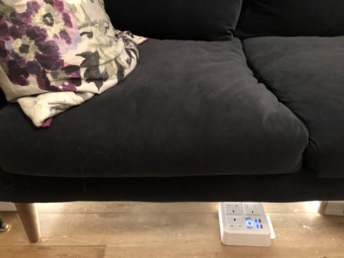 If you want to plug in a laptop or USB device we have put a easily accessible connector for you directly under the couch (see below).